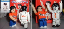 キャラウィール、デロリアン&ナイト2000(各600円) 「おいキットぉ!! デロリアンなんかに負けるなよ」(声・佐々木功) ヒュオンヒュオン(ライト音)「私の最高時速は500キロ・・あいつは140キロ オーバーで姿をくらますチキン野郎ですから勝負になりませんよ」(声・野島昭生) 「ぼくのことをチキン(臆病者)って言うなァ〜〜っ!!」(声・三ツ矢雄二) |