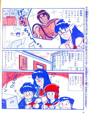 ハローエンジェル <お便り紹介> 冴子先生の好きなカセットはなに?(福岡県・松永龍一クン) ▽冴子先生は好ききらい関係なくゲームしちゃうから 上手なんだよ! <ひと口メモ> 少年キャプテン・コミックスからみなづき先生の 「これもん!アイドル」が出ているのを知ってる? 興味があったら読んでみてね! 最終ページ解説 「げべろっちょ〜っ!!」とコケているのはコサキンネタ・・・ (小堺一機さんと関根勤さんのTBSラジオ番組)。 当時、これが番組内で紹介され、放送作家の 鶴間さんが大ウケしていました・・・・ 柱のコメントが「ご愛読ありがとう・・・・」・・・って まるでコサキンネタやったから終わっちゃったみたいに 見えたらしい・・・(^_^;) 「新しいお仕事がんばって下さいね」と番組内で 励まされたのを覚えております。 |