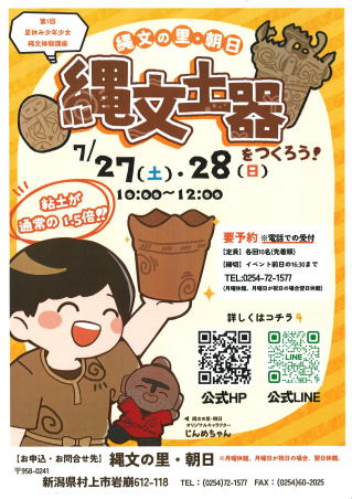 夏休み少年少女縄文体験講座 「縄文土器づくり」 7月27日(土) 7月28日(日 時間:10時~12時 参加料: 300g:500円 600g:900円 ※粘土が通常の1.5倍 定員:各日10名(先着順) 終了しました。 |