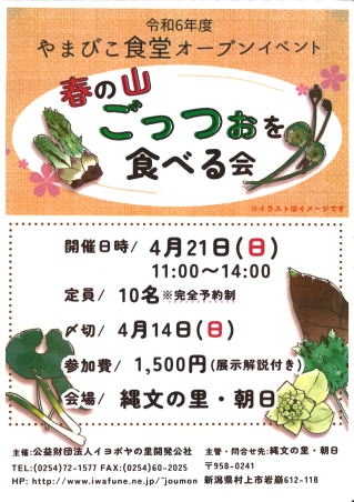 春の山ごっつぉを食べる会 4月21日(日) 11時 ~ 14時 参加費:1,500円 (展示解説付き) 定員:10名 満員御礼 終了しました。 |