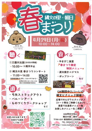 春まつり 4月29日(月・祝) 午前10時~午後2時 『縄文ピクニック』 開催期間 5月3日(金・祝)~ 5月6日(月・祝) ※4月30日(火)休館日 終了しました。 |