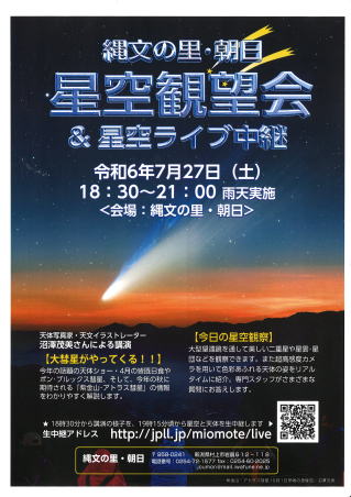 星空観望会&星空ライブ中継 7月27日(土) 18:30~21:00 参加費:無料 生中継アドレスは「コチラ」 ※当日の18時30分~ 終了しました。 |