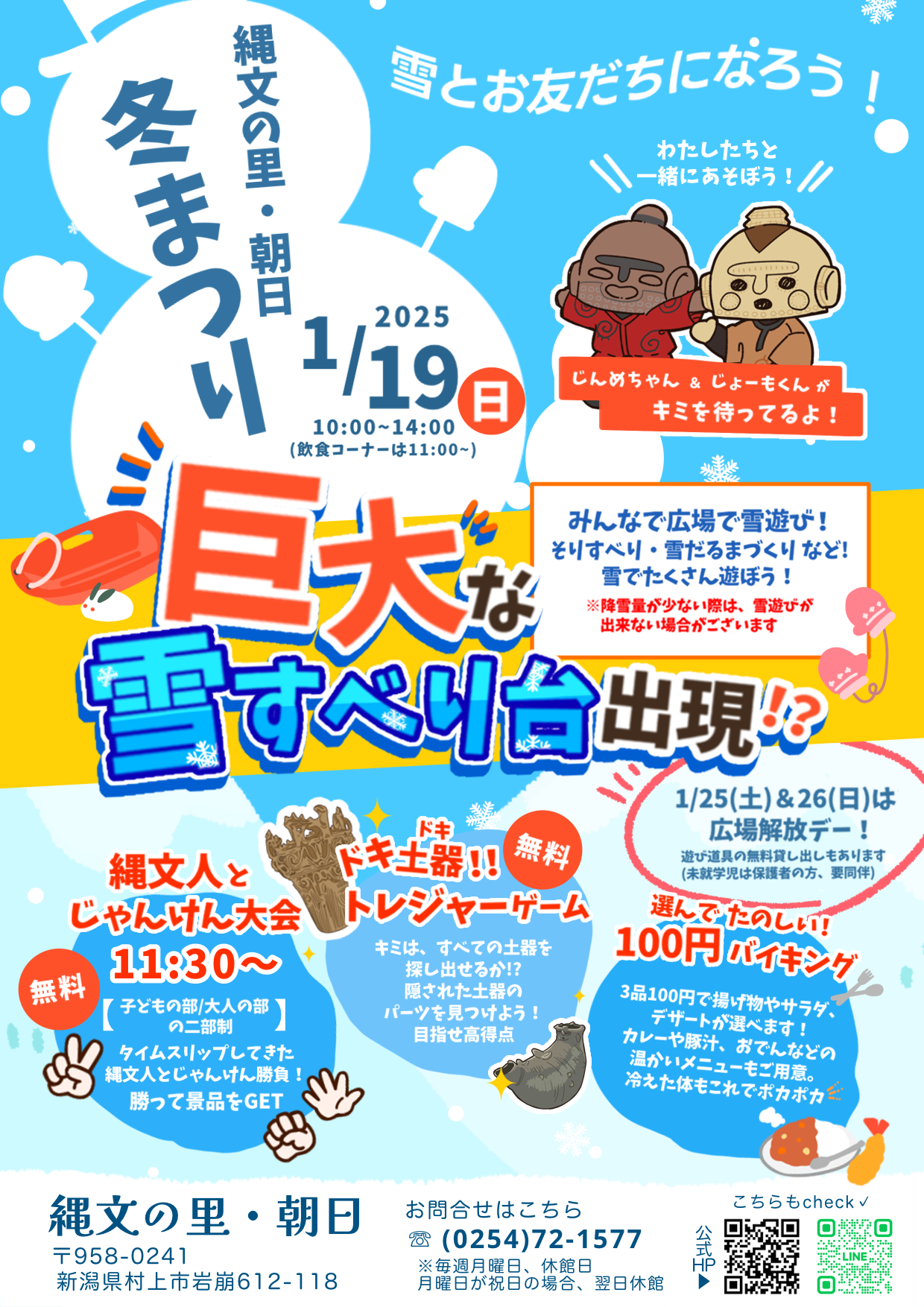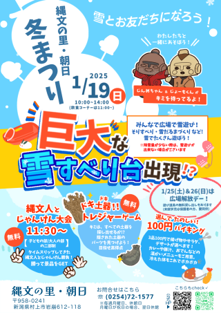 縄文の里・朝日 冬まつり 巨大雪すべり台出現 いっぱい遊んで‼ 雪と友だちになろう ・日 時:令和7年1月19日 10時~14時ごろ ・外会場:巨大雪すべり台 ジャンボシャボン玉 ・内会場:ドキ土器‼ トレジャーゲーム 10時~ じゃんけん大会 11時30分 ・楽しいランチ:11時~ 100円で3品選べるバイキング 他にカレー・豚汁・おでんなど 終了しました。 |