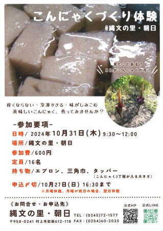 こんにゃくづくり体験 10月31日(木) 9時30分~12時 参加費:600円 定員:16名 終了しました。 |