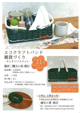 エコ・クラフトバンド 「雑貨づくり」 7月11日(木) 9:00~14:00 参加費:1,000円 定員:10名 ※昼食は各自ご用意下さい。 終了しました。 |