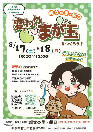 夏休み少年少女縄文体験講座 「変わりまが玉づくり」 8月17日(土) 8月18日(日 時間:10時~12時 参加料:500円 定員:各日15名(先着順) 終了しました。 |
