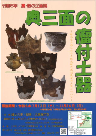 2024年 夏・秋の企画 「奥三面(おくみおもて)の瘤付土器」 開催期間 7月13日(土)~ 11月24日(日) 毎週月曜:休館日 祝日の場合は火曜日 観覧料 大人「400円」 小人「100円」 小人(高・中・小学生) ※20名以上団体料金 大人「320円」 小人「80円」 終了しました。 |