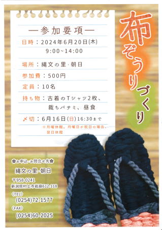 布ぞうりづくり 6月20日(木) 9:00~14:00 参加費:500円 ※昼食持参 定員:10名 終了しました。 |