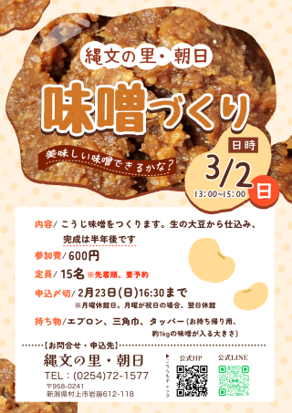 味噌づくり 意外と簡単? 自分で作れば、 「手前みそですが」 って言えますよ お気軽にお申込みください 日 時:令和7年3月2日(日) 内 容:こうじ味噌を作ります。 生の大豆から仕込みます。 じっくり寝かせて、 半年後に完成です。 参加費:600円(材料費など込み) 持ち物:三角巾・エプロン・ お持ち帰り用のタッパー (約1㎏の味噌がはいる大きさ) 満員御礼 終了しました。 |