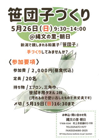 「笹だんごづくり」 5月26日(日) 9:30~14:00 参加費:2,000円 ※(昼食代込み) 定員:20名 満員御礼 終了しました。 |