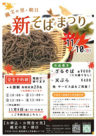 新そばまつり 11月10日(日) 完全予約制 10時~11時(20名)満員 11時~12時(20名)満員 12時~13時(20名)満員 13時~14時(20名)満員 新そば:600円 天ぷら:400円 終了しました。 |