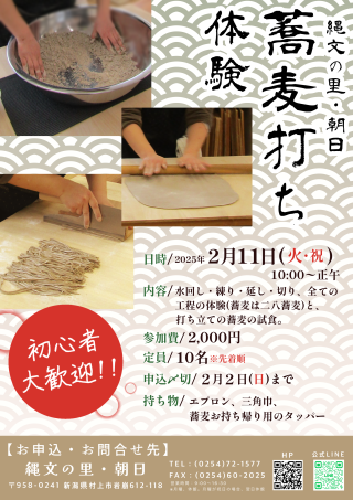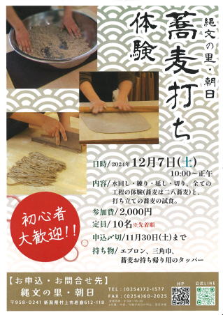 「そば打ち体験」 12月7日(土) 10:00~12:00 参加費:2,000円 定員:10名 満員御礼 終了しました。 |