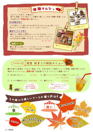 秋まつり&音楽祭 9月29日(日) 午前10時~午後2時 ※音楽祭は2時30分迄 参加費:無料 ・体験マルシェ ・食堂特別メニュー ※通常「体験メニュー」は混雑時はお断りする場合がございます。 終了しました。 |