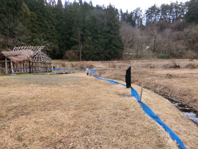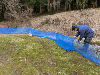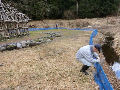 | 2021年3月24日(水) 「管理運営」業務 今年も「イノシシ」対策のネットを張りました(^o^)丿 雪の重みで破れるので冬場に撤去していました。 「復元住居」付近に餌を探して掘った跡が有りました。 3 |