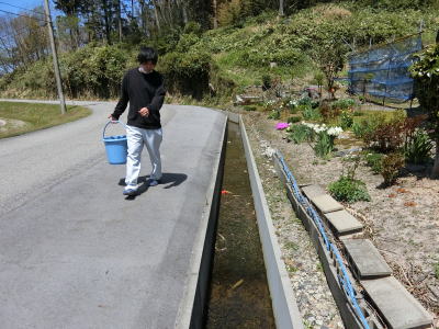 ![]() 固まった土を流す |