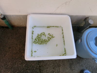 | 2021年4月23日(金) 「収益拡大」業務 「イヨボヤ会館」の「木村」主任と「水草」を取りに行きました(^o^)丿 イヨボヤ」会館で育てている「浮草」も貰いました(^J^) 「メダカ」の水槽に入れます(^<^) 3.5 |