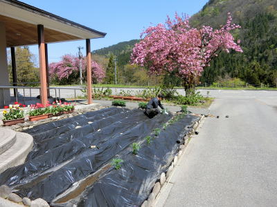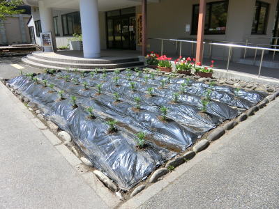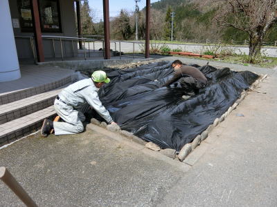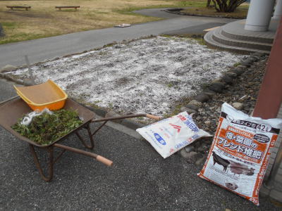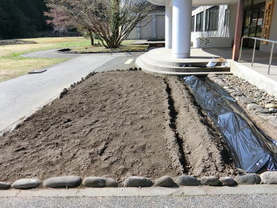 | 2021年4月9日(金) 「管理運営」業務 「花壇」の準備をしました(^o^)丿 「石灰」と「堆肥」を撒いて開墾しました(^J^) 土を耕した後に、「ウネ」を作り、「農業用マルチシート」を張りました(^o^) 3 |