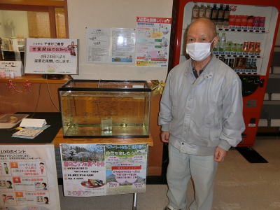 | 2021年4月7日(水) 「誘客推進」業務 ロビーに「メダカ」を展示しました(^o^)丿 当館の池で採取したメダカです(^J^) 「和田」館長が自宅から「空いている水槽」を持って来てくれました(^<^) 3 |