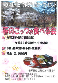 2021年4月8日(木) 「管理運営」業務 「新型コロナウイルス」感染拡大防止の為、4月18日(日)に予定していた『春のごっつお食べる会』は中止になりました。 ここ2週間で、感染状況が著しく拡大している事をうけて、所管課からご連絡がございました。 3 |