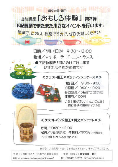 | 2021年7月11日(日) 「誘客推進」業務 『夏休み宿題お助け講座』が開催されます(^o^)丿 土器づくり ・7月29日(木)と31日(土) ・参加費「500円〜1,000円」(※重さによる) 変わりまが玉づくり ・7月30日(金)と8月1日(日) ・参加費「500円」 お問合せ(0254)72ー1577 3 |