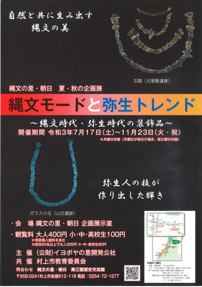 | 2021年7月15日(木) 「誘客推進」業務 夏・秋の企画展が開催されます(^o^)丿 「縄文モード」と「弥生トレンド」 〜縄文時代・弥生時代の装飾品〜 会 場:縄文の里・朝日 企画展示室 観覧料:大人400円/小中高校生100円 準備に「大汗」をかきながら頑張っていました(^J^) 皆様のお越しをお待ちしております(^◇^) t土日祝日」のお昼には「やまびこ食堂」も営業しています(^o^) 3 |