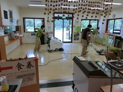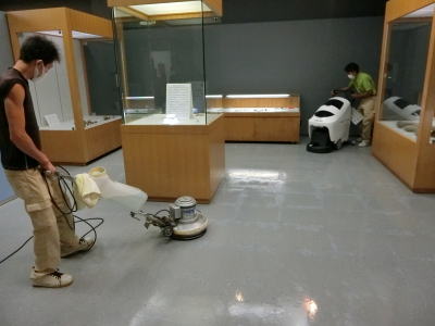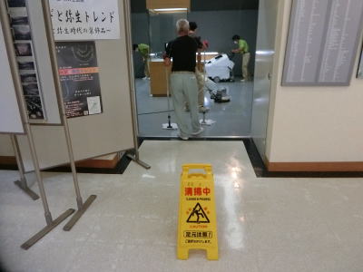 | 2021年7月26日(月) 「管理運営」業務 ※休館日 専門業者様が館内の「ワックス清掃」を行いました(^o^)丿 動かせる物は一旦、別の場所に移し、広く作業をされました(^<^) 専用の機械や人手を使い、床の汚れを落とし、ワックス掛け行いました(^J^) 0(Dr.S) |