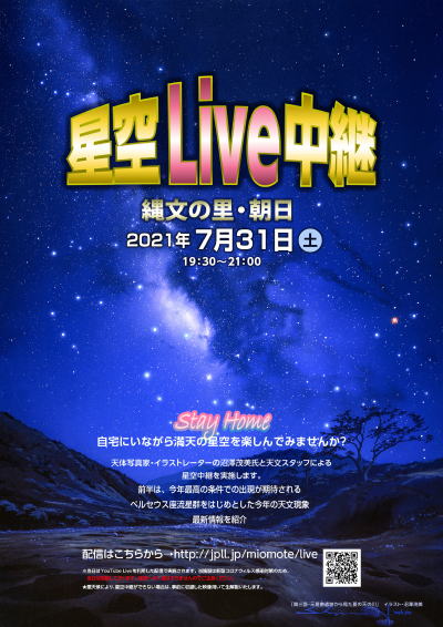 2021年7月30日(金) 「誘客推進」業務 明日、31日(土)に「星空Live中継」を縄文の里・朝日から行います(^o^)丿 新型コロナウイルス感染拡大防止の為、『無観客』で開催します。 生中継アドレスはhttp://jpll.jp/miomote/liveになります(^J^) ※現在はここを開くと昨年のアーカイブが見られるようになっていますが、生中継中は生中継の画面に変わります。 |