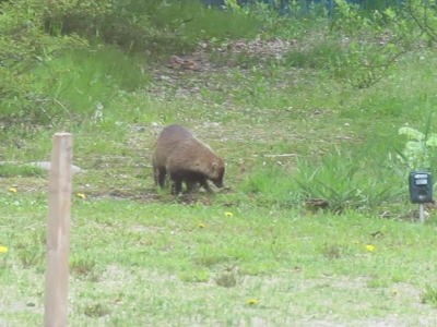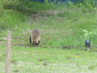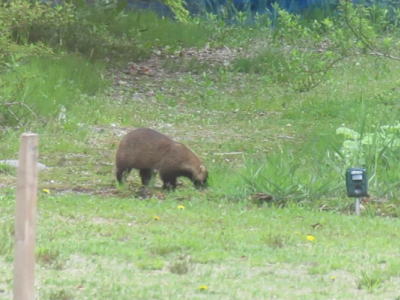 | 2022年5月17日(火) 「管理運営」業務 会館前の広場に「アナグマ」が出現しました(^o^)丿 土を掘り返し、「ミミズ」等を探していました(^J^) 「動物撃退器」の後ろまで来ていました(^<^) 3 |