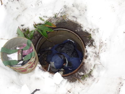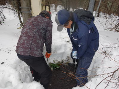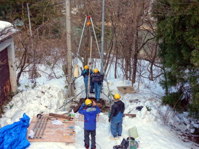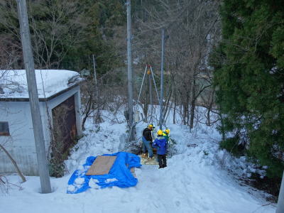 | 2023年1月18日(水) 「管理運営」業務 現在、「縄文の里・朝日」は断水中です。 故障した「水中ポンプ」の交換準備を行っています。 重機が入れないので「単管パイプ」で「やぐら」を組んでいました。 |