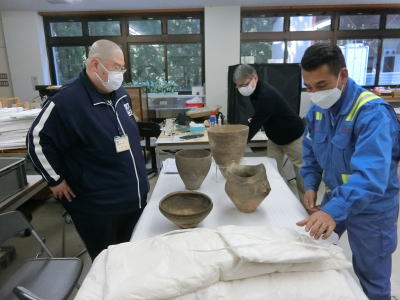 2023年3月15日(水) 「管理運営」業務 修復された「土器」が戻ってきました(^o^)丿 「元屋敷」遺跡の「浅鉢型土器(1個)」、「深鉢型土器(3個)」が完璧に修復されていました(^J^) 3 |