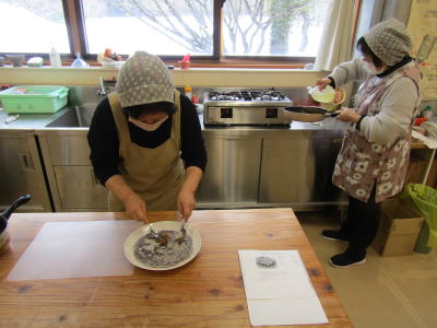 | 2023年3月4日(土) 「指定事業」業務 新しい「料理」を試作しました(^o^)丿 「春の山ごっつぉを食べる会」で出す予定です(^J^) 「クレープみたいな生地に「クルミ味噌」を塗り、丸く包みました(^<^) 生地には「古代米の粉」を入れました(^J^) 4 |