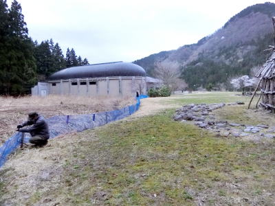 | 2023年4月12日(水) 「管理運営」業務 「イノシシ」対策で「ネット」を張りました(^o^)丿 今年も「復元住居」の近くに来ているみたいです(>_<) 今年は「イノシシ除けの札(忌避剤)」を取り付けました(^<^) 3.5 |