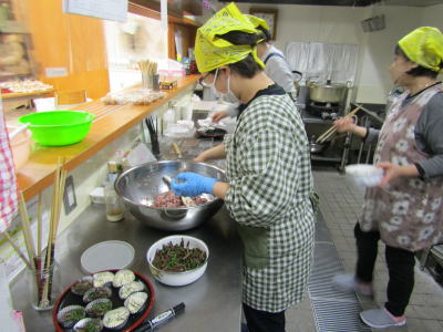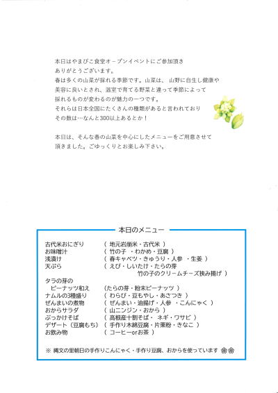 | 2023年4月16日(日) 「指定事業」業務 「春の山ごっつお食べる会」が開催されました(^o^)丿 今年も職員がアイデアを出しながら、地元食材を沢山利用したメニューになりました(^J^) アンケート集計も「非常に満足」が5名、「満足」が5名でした(^<^) 3.5 |