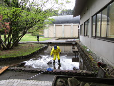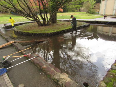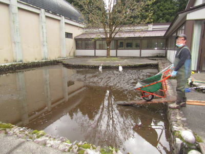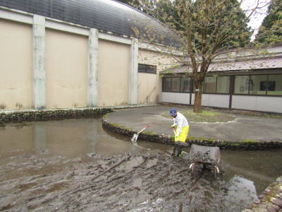 | 2023年4月18日(火) 「管理運営」業務 「河崎」館長と施設管理員が池の清掃を行いました(^o^)丿 一旦、水を抜き、底に溜まった「落ち葉」と「泥」を一輪車で廃棄しました(^J^) 水を含んだ「泥」の処理に苦労しておりました。 3.5 |