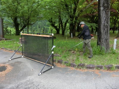 |  | 2023年5月18日(木) 「管理運営」業務 施設管理員が小雨の中、公園の草刈りをしました(^o^)丿 「飛び石」防止のネットを動かしながら作業です(^J^) 「木の葉」のおかげであまり濡れていませんでした(^<^) 3.5 | |||