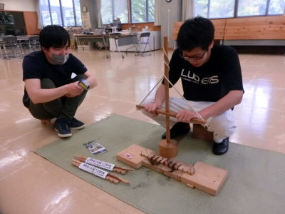 2023年6月30日(金) 「管理運営」業務 村上東中学校の二年生(2名)が職場体験に来てくれました(^o^)丿 村上市の所管課が受け入れをしたのですが、あいにくに「雨」で「お城山」で活動が出来なくなり、急遽、来られました(^J^) 「まが玉」作り、「火おこし」体験で使う「小物」を作って貰いました(^<^) 3.5 |