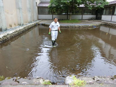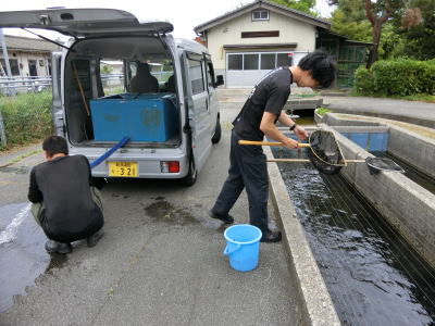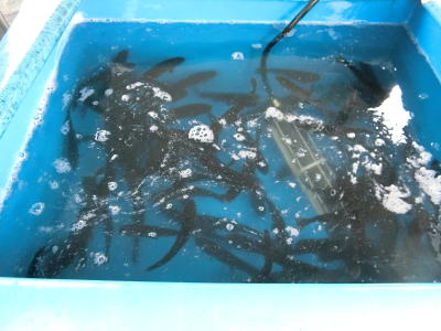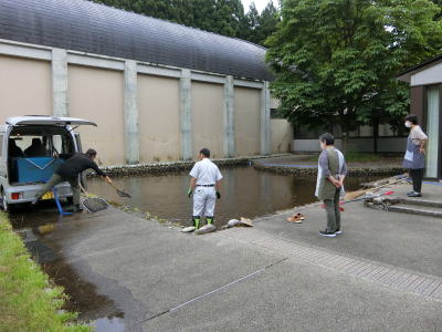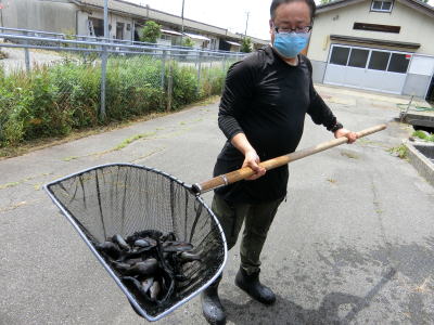 | 2023年6月29日(木) 「誘客推進」業務 「ニジマス」の「釣り体験」の試験をしました(^o^)丿 「河崎」館長のツテで岩船小学校より「オケ」を借りてきました(^J^) 今回は徐々に水温を調整しながら「オケ」に泳がせました(^<^) 3.5 |