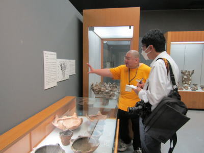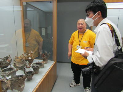 | 2023年7月12日(水) 「誘客推進」業務 「いわふね新聞社」の「大滝」記者様が取材に来てくれました(^o^)丿 苗字を見て、気になってお尋ねしたら、前社長の息子さんでした(^J^) 7月15日から始まる特別展「火焔型土器の世界」の内容を詳しく取材されていかれました(^<^) 「野田」学芸員が丁寧に説明しました(^J^) 3 |