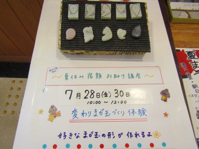 | 2023年7月22日(土) 「誘客推進」業務 「夏休みお助け講座」の準備をしていました(^o^)丿 8月28日(金)と30日(日)に行う「変わりまが玉」のブレスレット用の小さい石を作っていました(^J^) 当日じゃ「予約制」で「特製カレー」も500円で提供します(^o^) 3.5 |