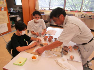 | 2023年7月27日(木) 「指定事業」業務 「夏休みお助け講座」が開催されました(^o^)丿 今回は「河崎」館長が講師をされました(^J^) 「200g」×2個を使い、親子で「土器」を作りました(^<^) 予約の「特製カレー」を提供しました(^J^) |