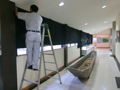 2025年10月8日(水) 「自主事業」業務 「秋まつり」で「雰囲気」作りで張った「暗幕」を外しました(^o^)丿 「入口」は残しました(^J^) 「縄文人」の身長を体験できる仕掛けになっています(^<^) 3.5 |