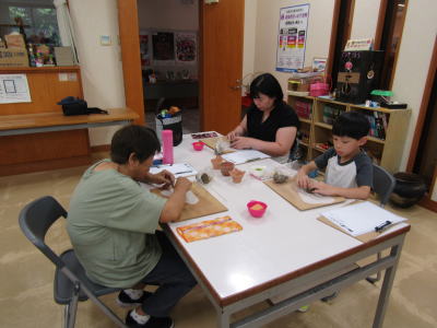 | 2025年7月26日(土) 「指定事業」業務 「夏休み少年少女体験講座」『縄文土器を作ろう』が開催されました(^o^)丿 最初に館内を見学して、土器の種類を学び、自分の作る「土器」をイメージしてもらいました(^J^) ご家族に手伝って貰いながら、楽しく「土器」を作りました(^o^) |