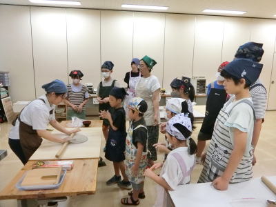 | 2025年7月29日(火) 「管理運営」業務 「下助渕子ども会」の皆様が来られました(^o^)丿 「そば打ち」体験と館内のご見学をされました(^J^) 「4人」1グループで「3班」に分かれて作業をしました(^<^) ソバを「細く」切るのが難しそうでした(^o^) |