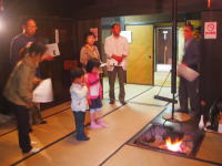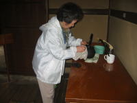 ![]() 囲炉裏の「鉄瓶」を磨く阿部さん |