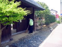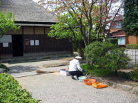 | 2009年5月18日 「嵩岡家・岩間家」では「13日」にご紹介した「藤」の花が前日の強風で沢山散っていました。(>_<) 管理人の村山さんが一生懸命、掃いていました。(^ム^) 花びらが細かく、広範囲に飛んでいましたので、とても大変そうでしたが『自分は気が長いから、こんな仕事は大好きだよ(^o^)』と、心強いお言葉をいただきました。(^◇^) |