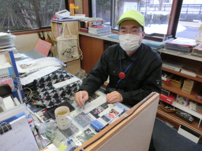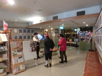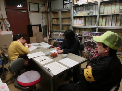 ![]() 資料館から避難してきた片野さんと荻野さん 本部で待機の竹部さん |