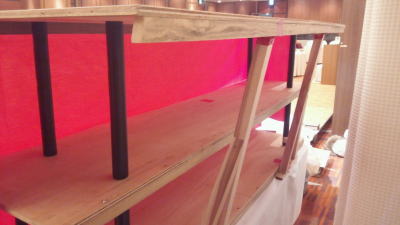 ![]() まるで大工さん(#^.^#)電動ドリルで足を取り付けます! 持ち帰りの時は、板を半分にたたみ、取り外して積み込みます(^◇^) |