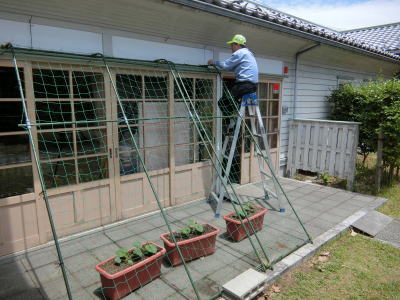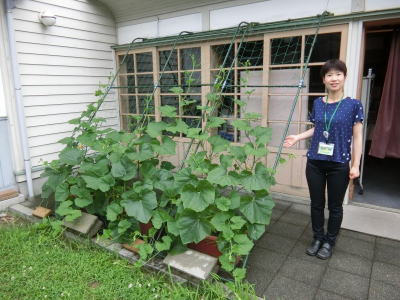 2016年6月23日(木) 「管理運営」業務 「緑のカーテン」が順調に育っています(^o^)丿 小さな実も付いています(^<^) 「こんなに大きくなりました」(^<^) |