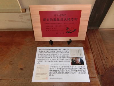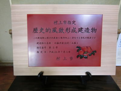 | 2017年7月21日(金) 「誘客推進」業務 「村上木彫堆朱」のプレートを飾っています(^o^)丿 村上市「歴史的風致形成建造物」に指定されました(^<^) 管理施設では下記に飾っています(^<^) ・旧嵩岡家住宅 ・旧岩間家住宅 ・旧藤井家住宅 ・旧成田家住宅 事業「137.9」→「139.6」SE 酒「144.7」→「145.7」SE 甘「31.6」SE 3 |