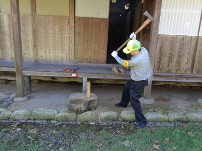 ![]() マキを割る |